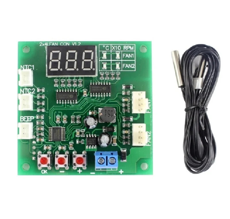 The 2CH 4 Wire LED Digital PWM Motor Speed Controller is a versatile device designed for DC motors operating at 12V, 24V, or 48V. Featuring a 4-wire configuration and a 50CM cable, it enables precise control of motor speed using pulse-width modulation (PWM). Additionally, it includes a temperature controller with an LED display and a buzzer alarm for effective monitoring and feedback. Ideal for fan applications.
